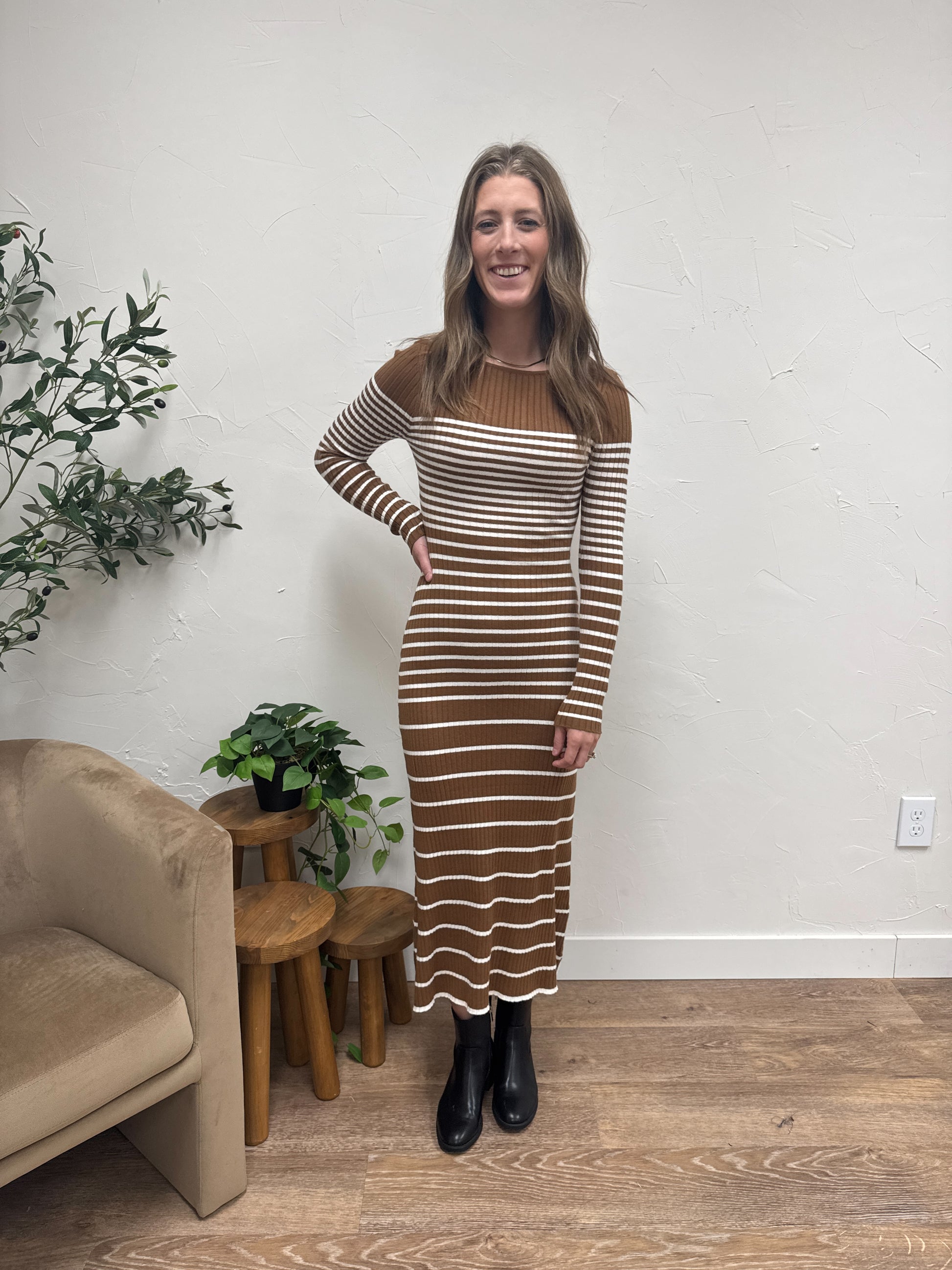 Boat neck Semi A-Line Stripe Dress