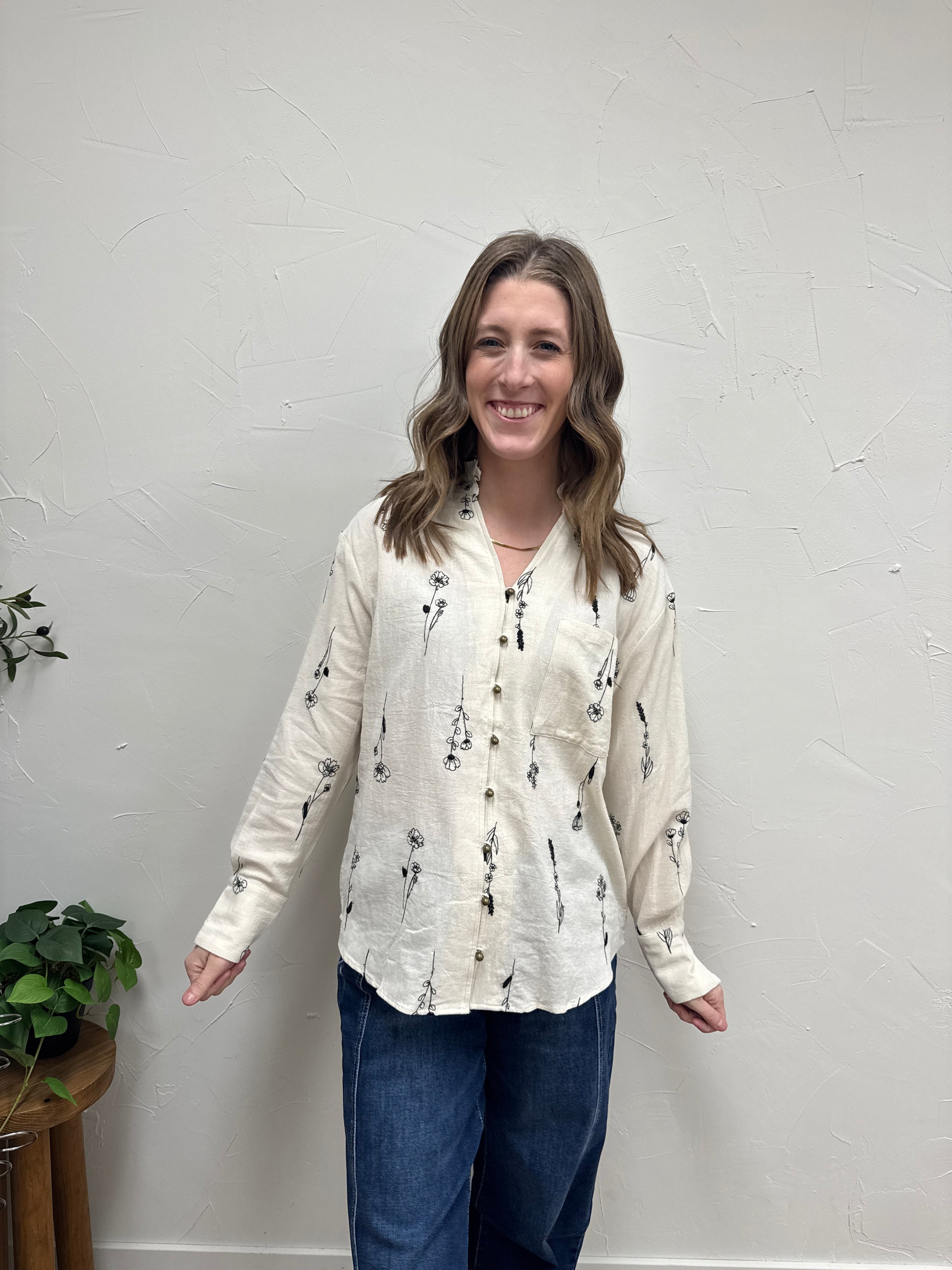 Botanical embroidery long sleeve top