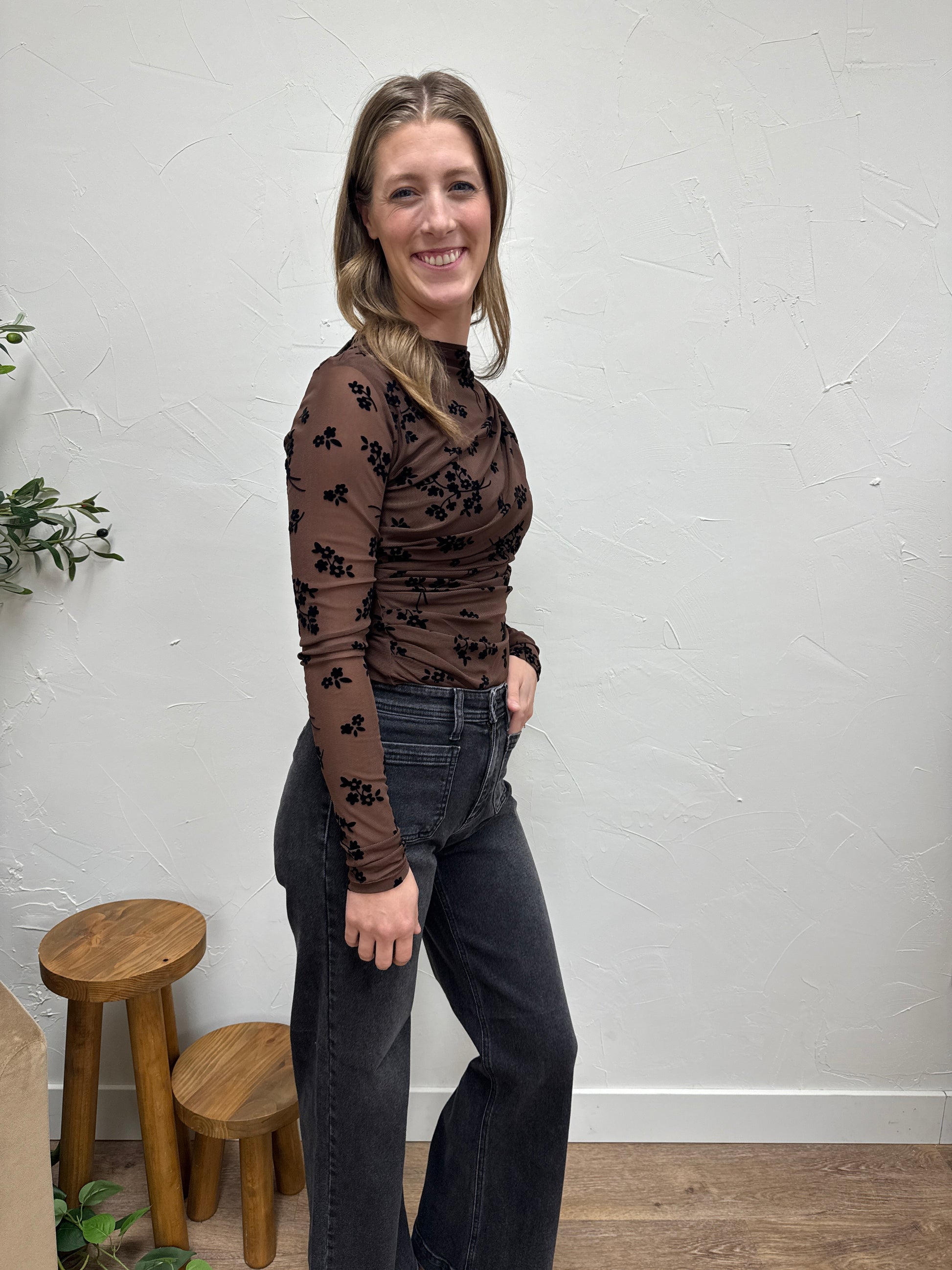High Neck Long Sleeve Mesh Velvet Bodysuit