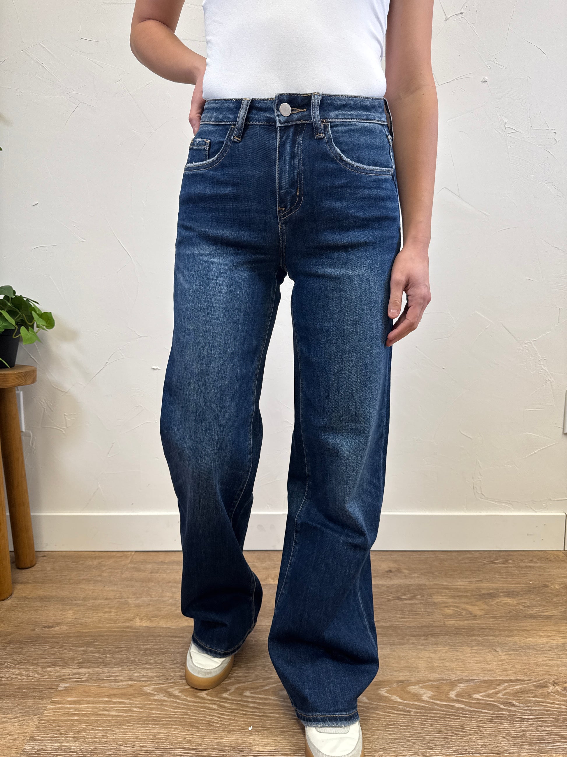 High rise dark wash full length wide jeans Comfort stretch denim, high rise waist, 5 pockets, finished hem, full length, dark wash, wide jeans