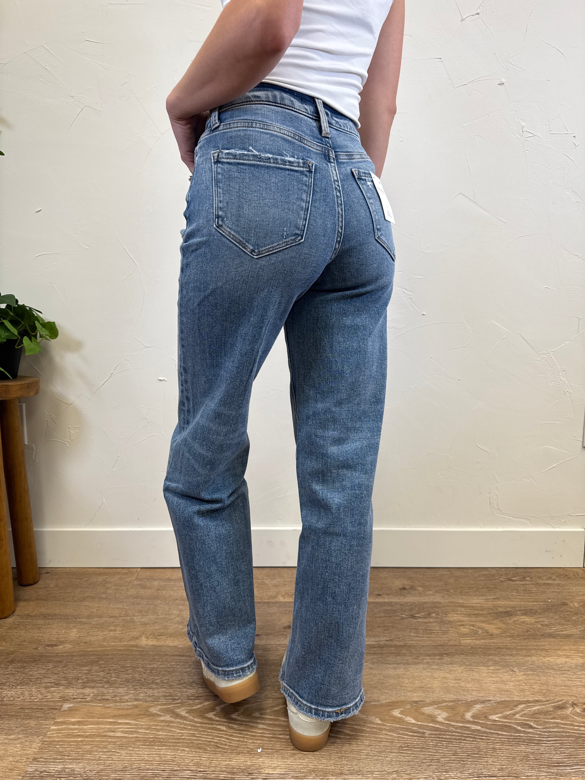 High rise medium wash full length wide leg jeans Comfort stretch denim, high rise waist, 5 pockets, finished hem, full length, medium wash, wide leg jeans