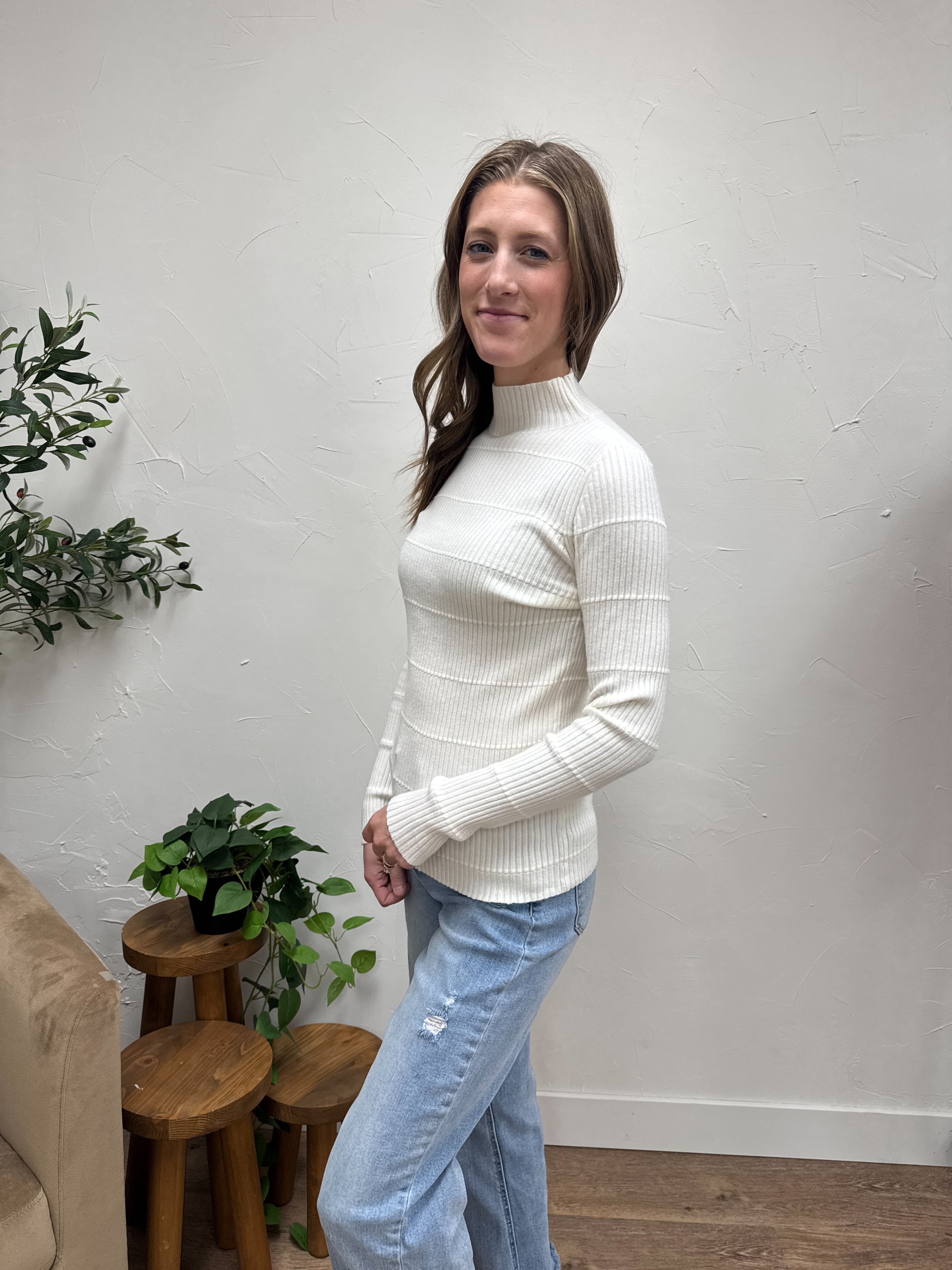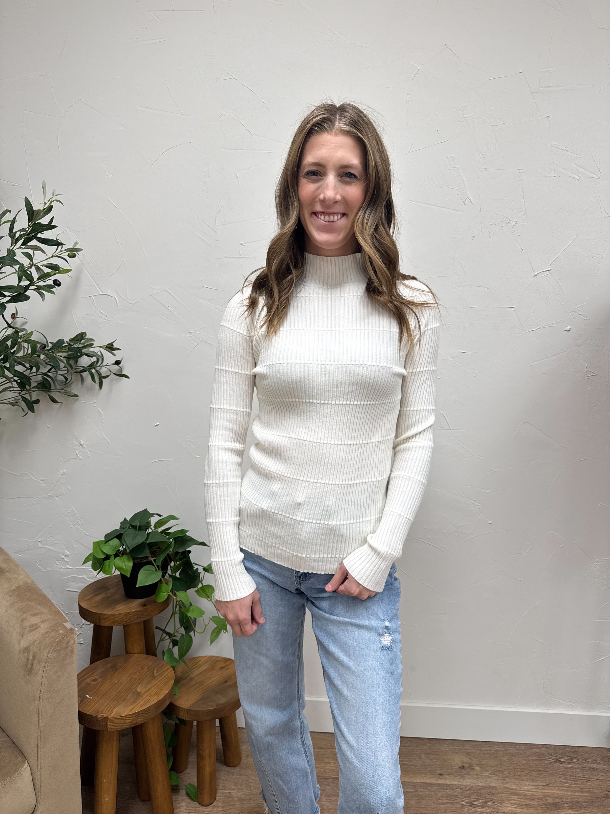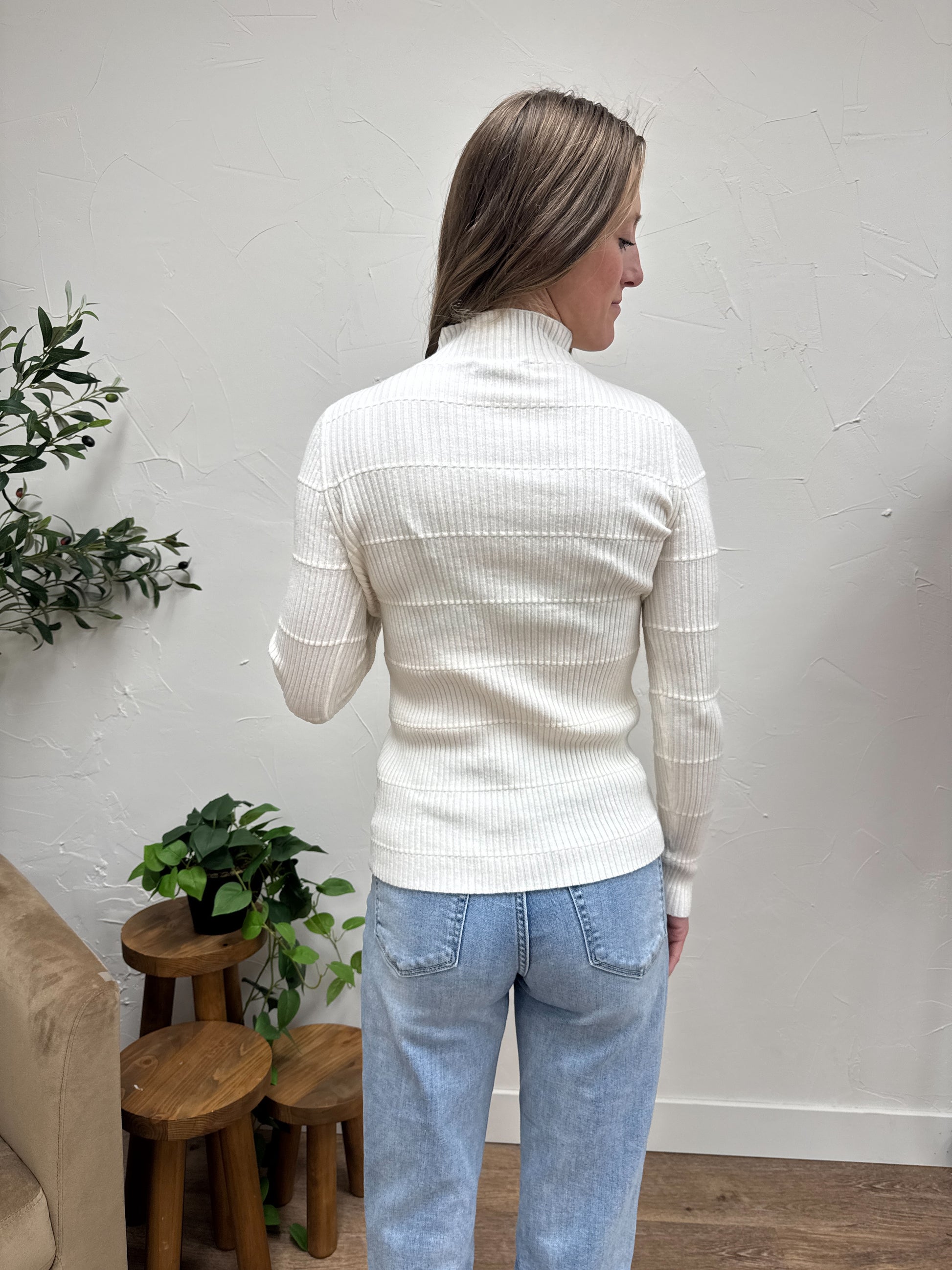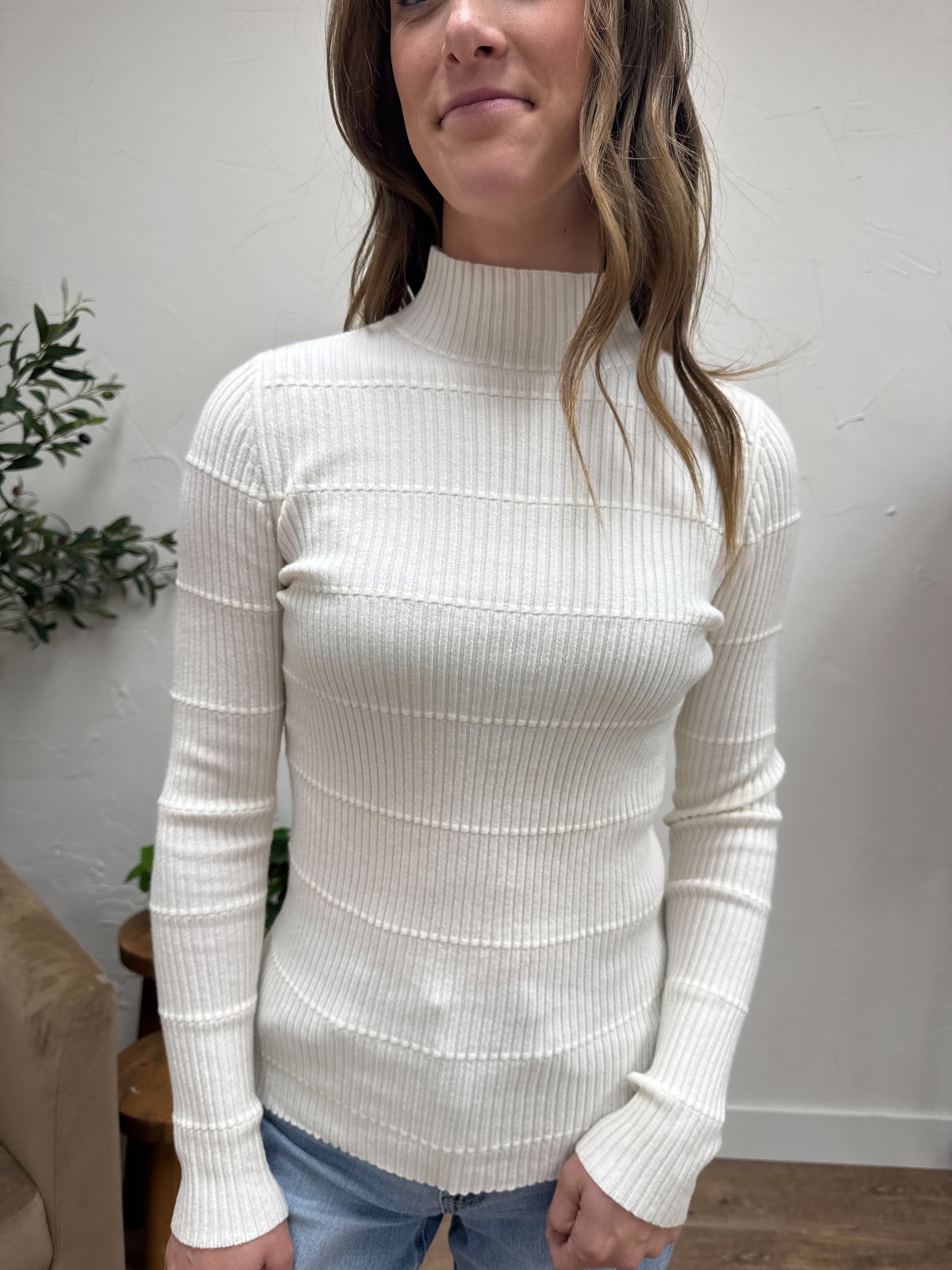 Pintuck Striped Fitted Solid Mock Neck Sweater