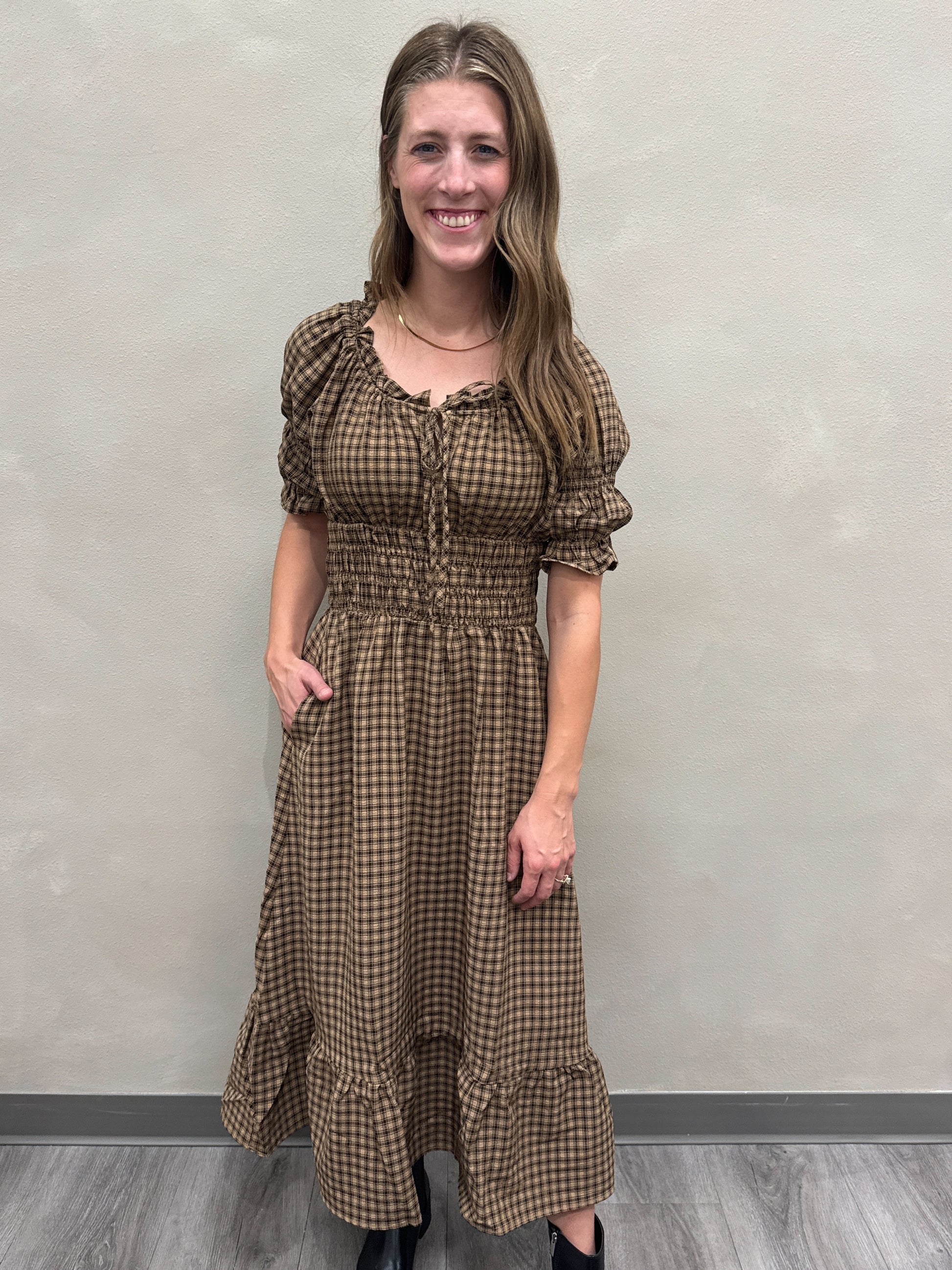 Scoop Neck Puff Sleeve Smocked Midi Dress